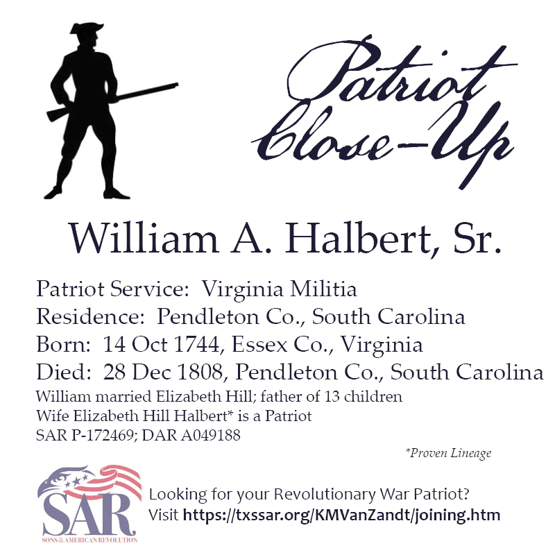 P-331150 / A049182 b. 1747 VA d. 1836 SC bur. in Halbert Family Cemetery, Anderson Co., SC |