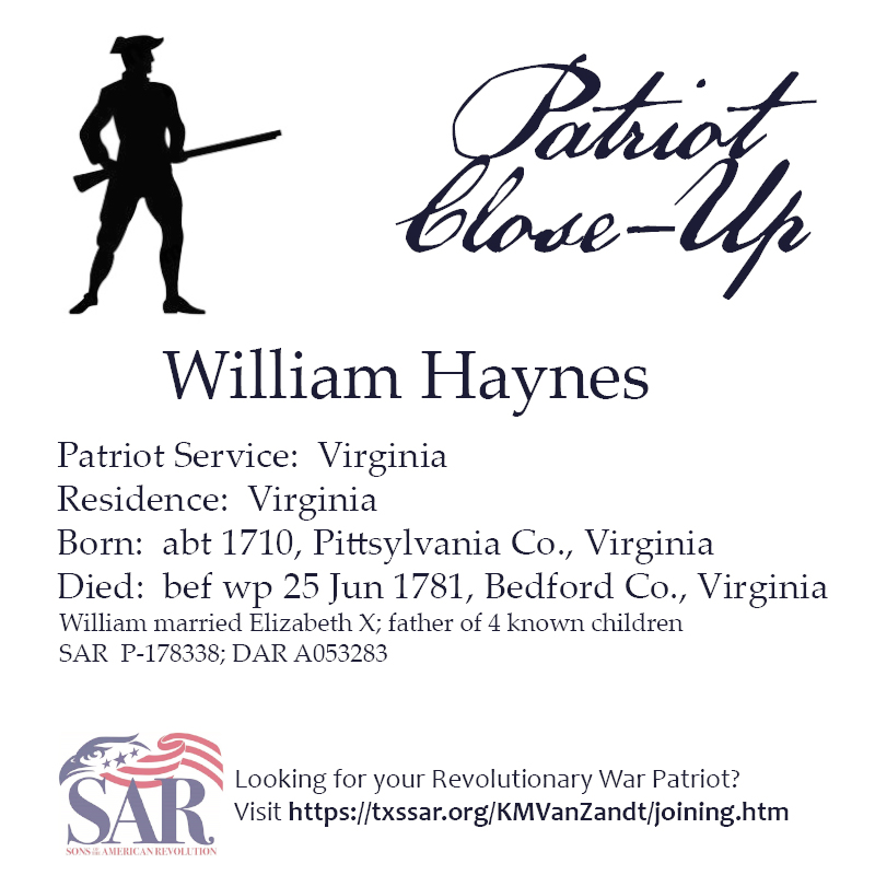 | Haynes, John Sr. | P-178296 / A053096 b. 1731 VA d. 1807 GA bur. in Oglethorpe Co., GA |